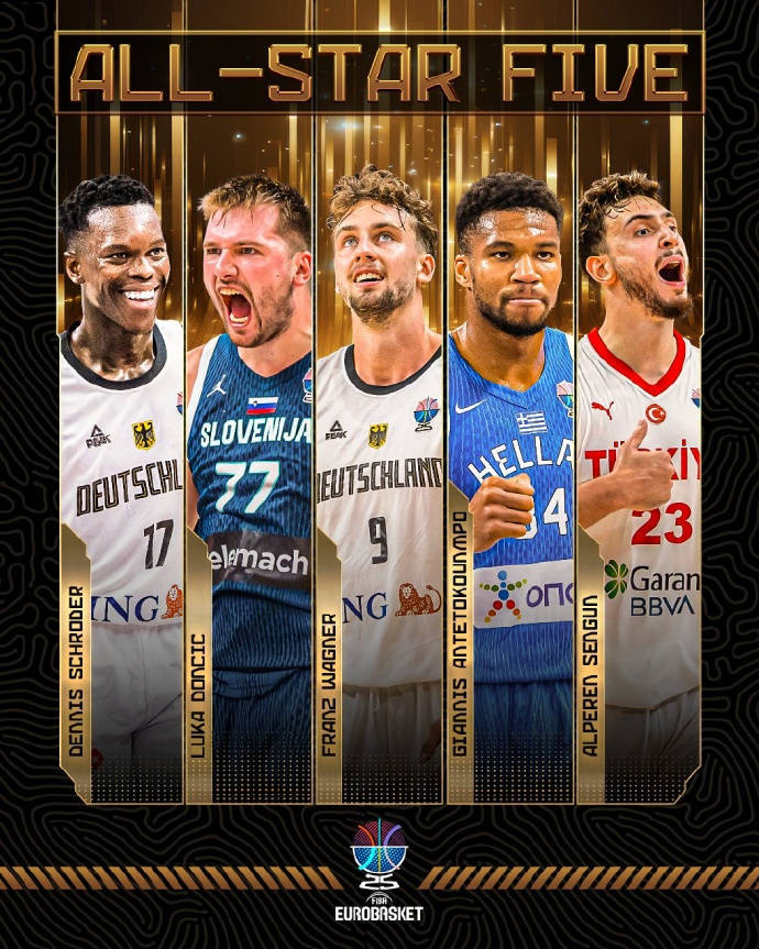 丹尼斯-施罗德(德国)、卢卡-东契奇(斯洛文尼亚)、弗朗茨-瓦格纳(德国)、扬尼斯-阿德托昆博(希腊)、阿尔佩伦-申京(土耳其)。